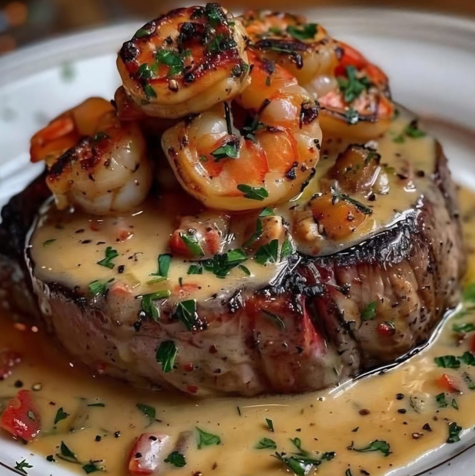 - Assemble: Place steak on plate, top with shrimp, and spoon over warm sauce. Garnish with parsley.