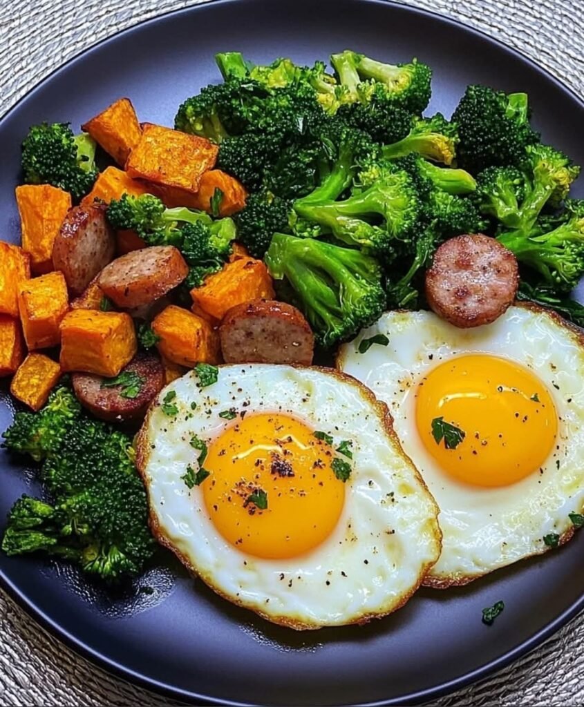 Start your morning with this hearty, colorful skillet that’s bursting with vegetables, lean protein, and flavor. Tender sweet potatoes, crisp broccoli, wilted spinach, and savory sausage come together in one pan, topped with perfectly fried eggs. It’s clean eating at its tastiest—high in protein, fiber, and vitamins to keep you energized without the crash! 0 “LARGE” 4 “LARGE” 2 “LARGE” 3 “LARGE” 8 “LARGE”