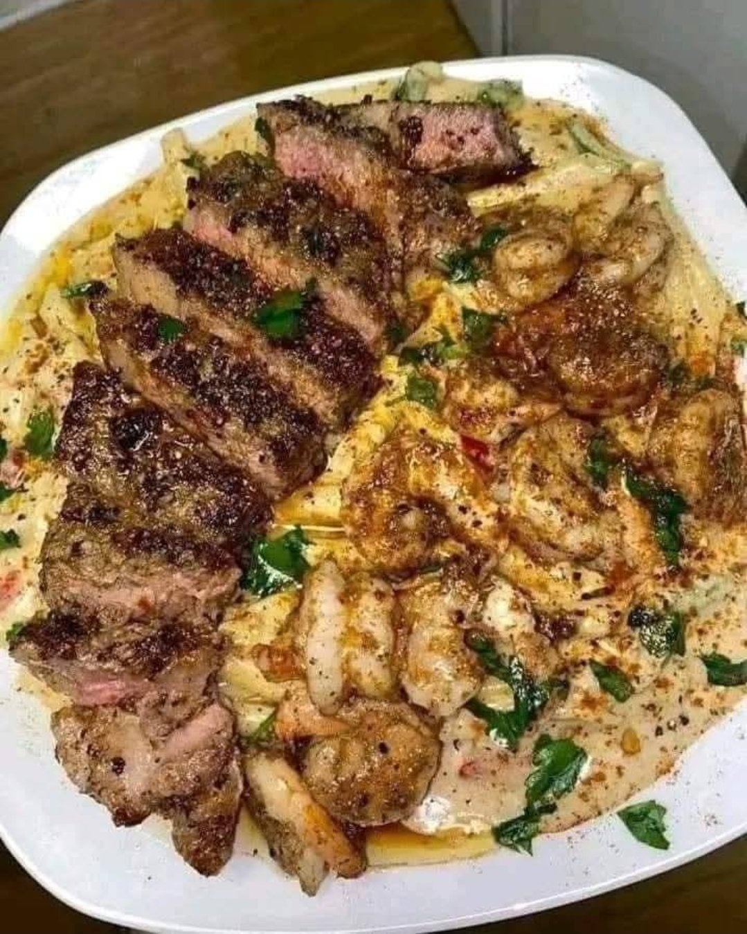 - Combine and Serve: Add the grilled steak, shrimp, and bell peppers to the Alfredo sauce. Toss to combine and heat through. Serve immediately, garnished with fresh parsley or extra Cajun seasoning for a spicy kick.