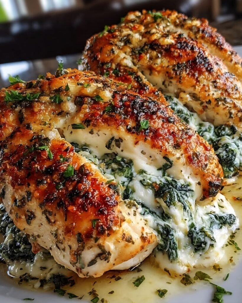 These juicy cheesy spinach stuffed chicken breasts are the perfect easy weeknight dinner! Tender chicken pockets filled with creamy spinach, mozzarella, Parmesan, and garlic, then seared and baked to golden perfection. Ready in just 30 minutes, naturally low-carb and keto-friendly — only 3g net carbs per serving!