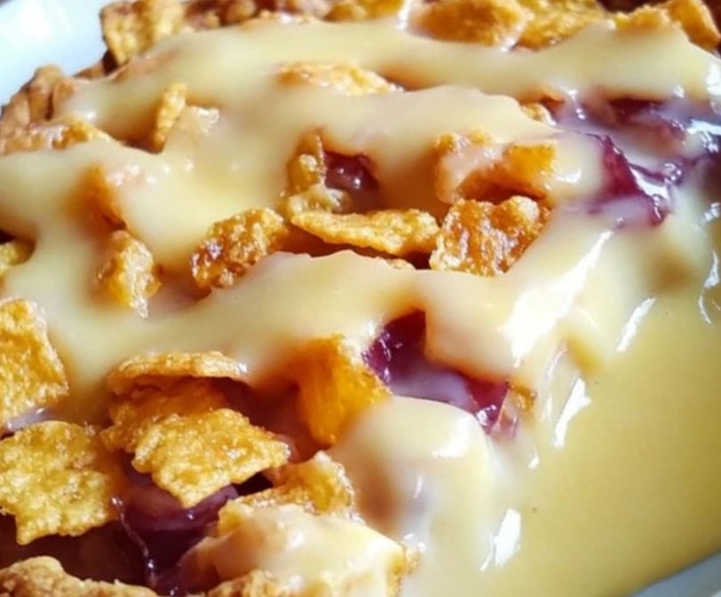 - Assemble: Spoon the cornflake mixture into the baked pastry case, pressing it down gently with the back of a spoon to create an even layer. Allow it to cool slightly while you prepare the custard.