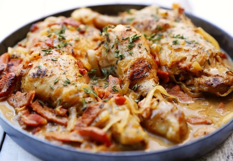 There’s something magical about autumn mornings when the sky turns that piercing, heart-bruising blue, the wind rustles through falling leaves, and the air carries a crisp promise of cooler evenings. As the season rushes in, it’s the perfect time to fill your kitchen with warming, hearty dishes—think slow-simmered stews, golden roasts, and earthy root vegetables scented with thyme, rosemary, and tarragon. This baked chicken casserole captures all of that comfort: juicy, skin-on chicken pieces nestled in a rich, tangy sauce made from dry apple cider, smoky bacon, and fragrant herbs. The cider reduces into a silky, apple-kissed gravy that clings to every bite, while the bacon adds irresistible smokiness.