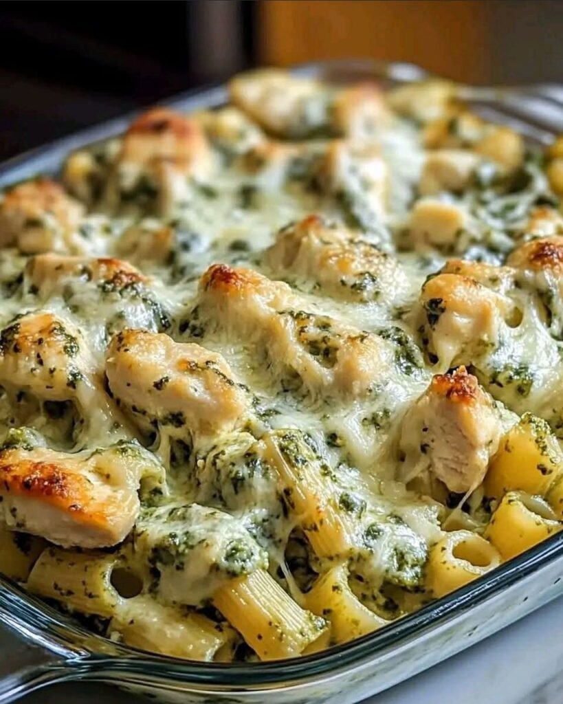 Creamy Basil Pesto Chicken Pasta Bake with Golden Cheese Crust