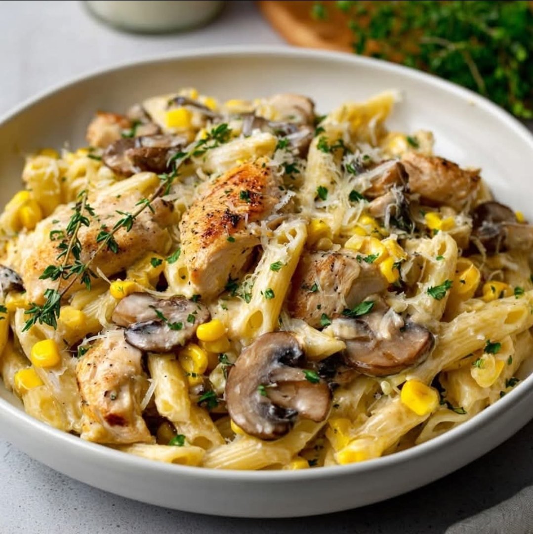 This one-pan Creamy Chicken, Corn & Mushroom Pasta is a cozy, hearty dish that’s perfect for busy weeknights or a comforting weekend meal. Tender chicken, earthy mushrooms, and sweet corn are enveloped in a velvety, cheesy sauce, all cooked together with pasta for a fuss-free dinner that’s bursting with flavor. 🍗🍄🌽🧀 Ready in under 30 minutes, this dish is sure to become a family favorite!