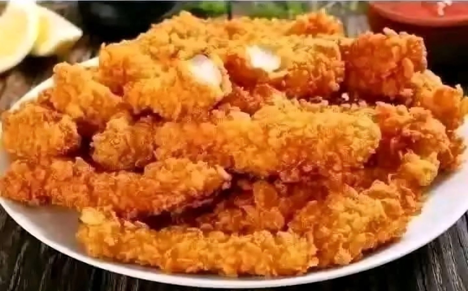 - Dip the strips in beaten egg, then coat with crushed roasted cornflakes.