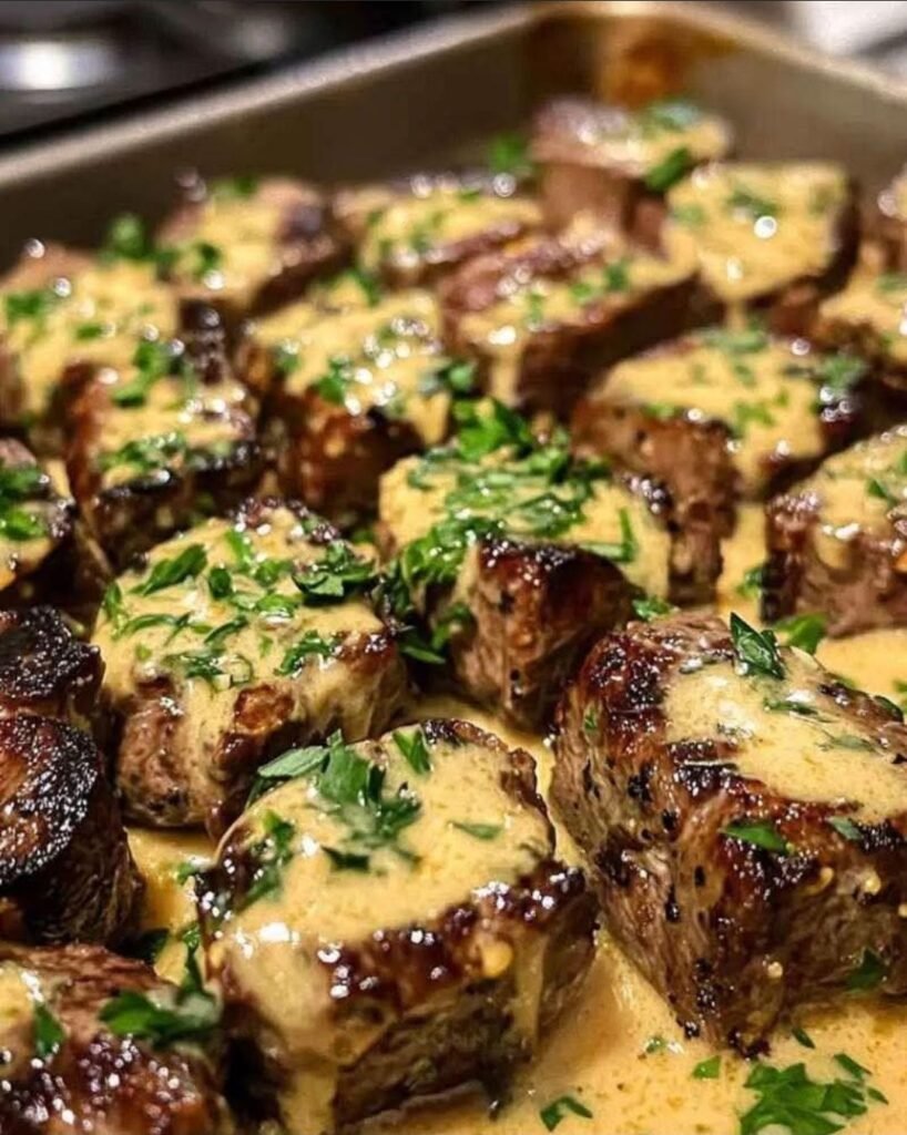 Garlic Butter Steak Bites Smothered in Creamy Parmesan Sauce