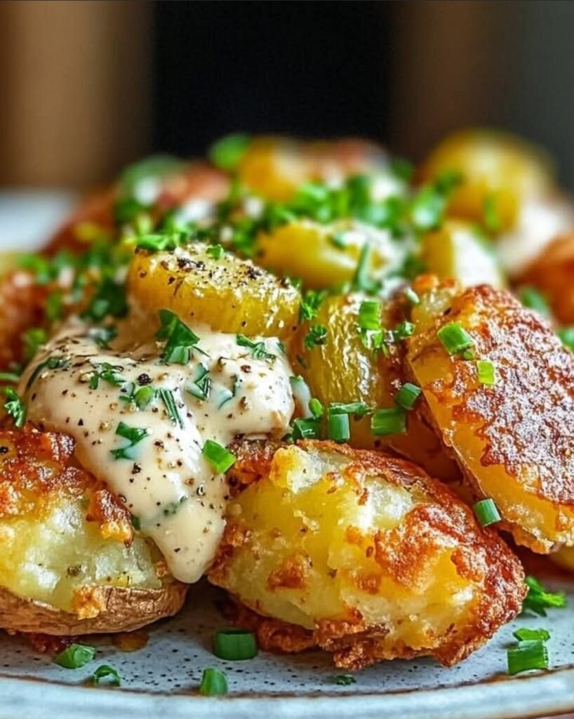 There’s something incredibly satisfying about smashed potatoes: that perfect contrast of shatteringly crisp, golden edges giving way to a fluffy, tender center. When you top them with a bright, creamy herb sauce inspired by classic tangy dressings, they transform from humble side dish into an irresistible crowd-pleaser. This version uses baby potatoes for bite-sized perfection, roasts them until deeply golden, and finishes with a luscious, no-cook sauce that brings freshness and zing.