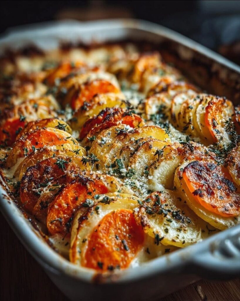 This comforting, cheesy vegetable bake layers thinly sliced potatoes and carrots, then smothers them in a rich, garlicky three-cheese cream sauce. It’s golden, bubbly, and perfect as a cozy side dish or vegetarian main. The natural sweetness of carrots balances the earthy potatoes and savory herbs—pure comfort food!