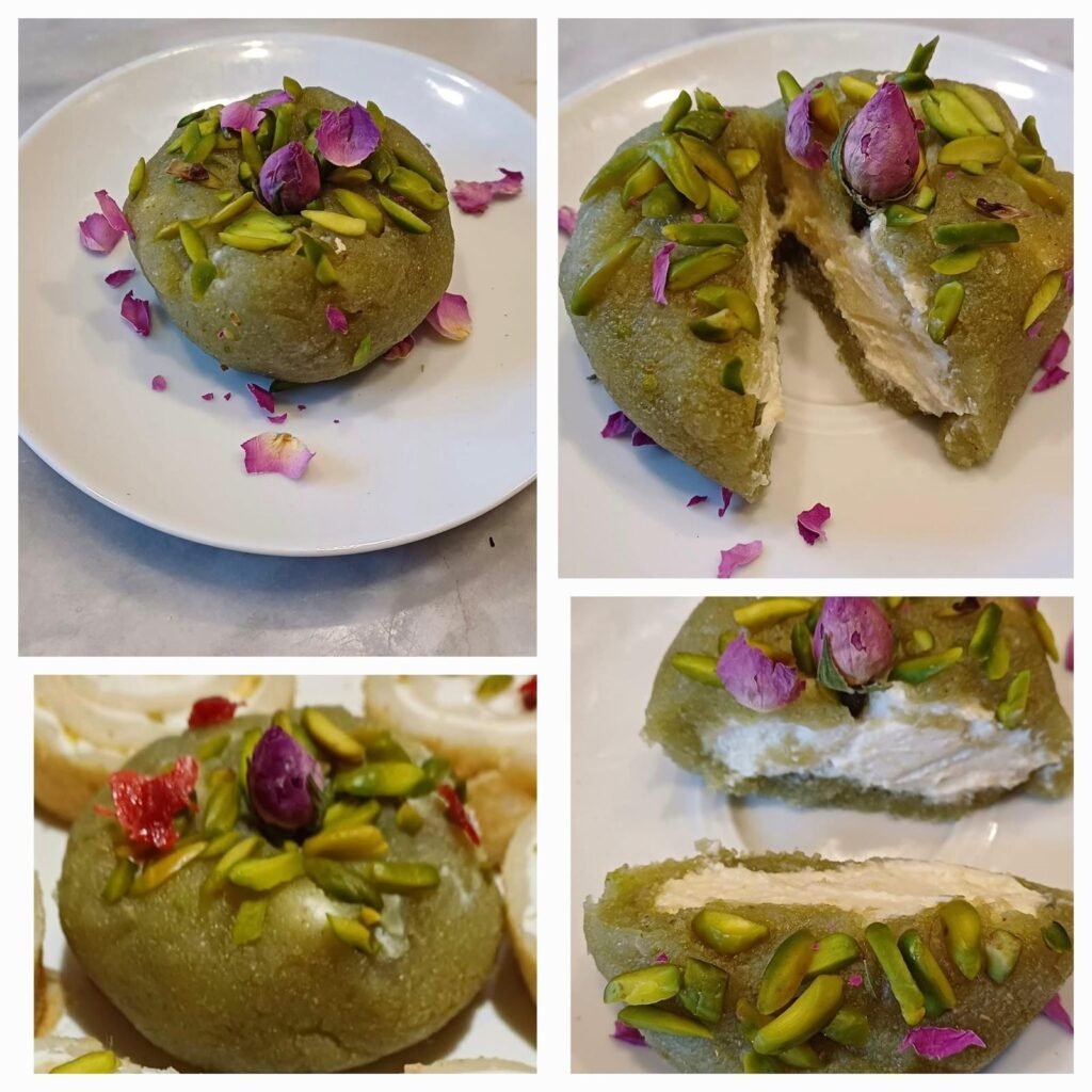 4. Shape the mixture into 12 balls. Hollow out each ball and stuff it with 1 tablespoon of the cream, then close the ball. Decorate with crushed pistachios and rose petals.