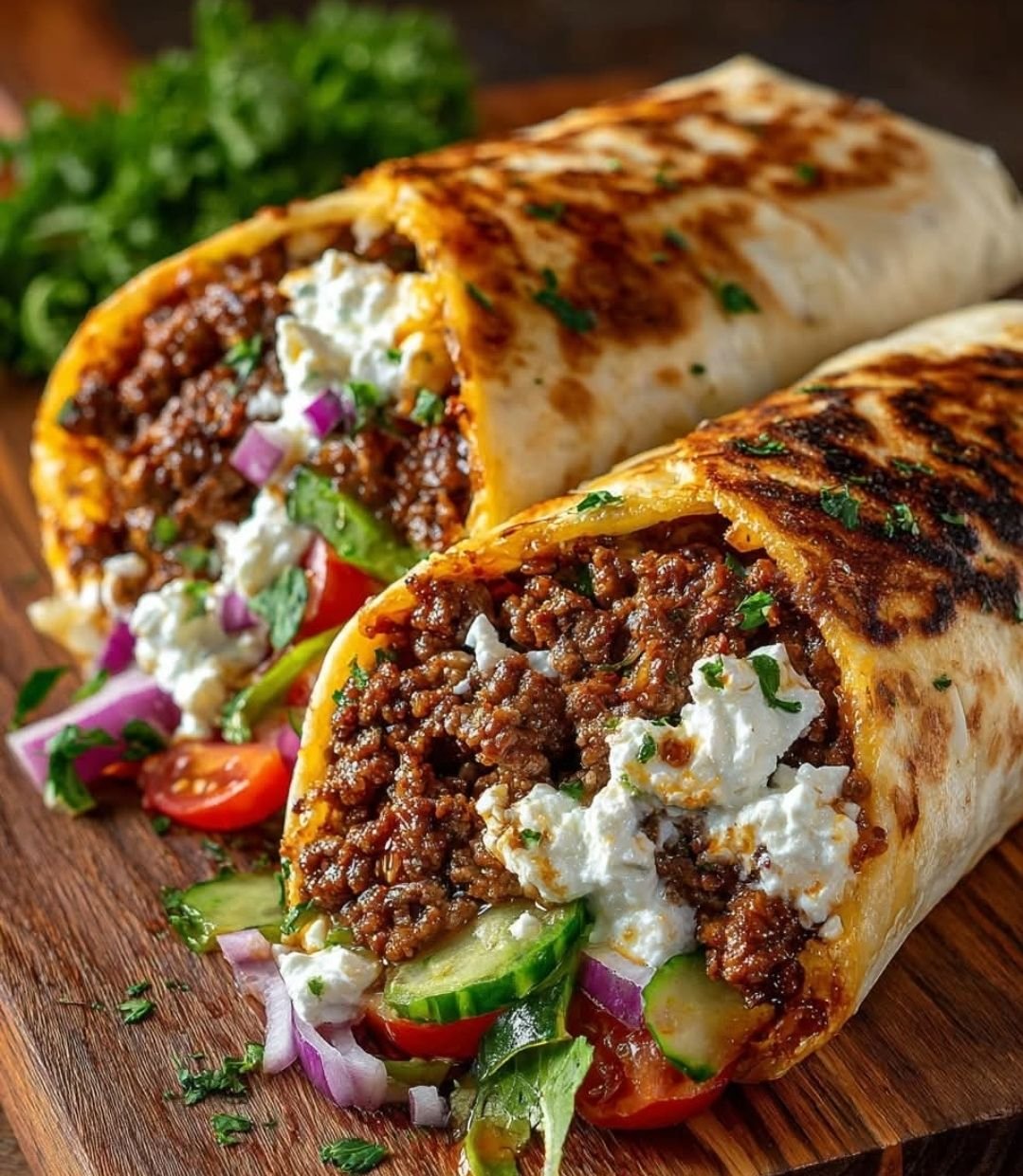 These wraps are a delicious fusion: juicy, smoky-spiced ground beef with hints of cumin and oregano, wrapped with crisp lettuce, cool cucumber, juicy tomatoes, and sharp red onion, all tied together by a silky, tangy feta-yogurt cream laced with hot honey and a kick of hot sauce. The contrast of warm beef, fresh veggies, and that sweet-heat creamy sauce makes every bite irresistible.