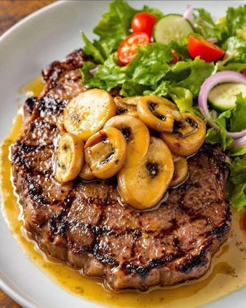This sizzling mushroom-topped ribeye steak with fresh salad is juicy, garlicky, buttery, and perfectly balanced—the kind of dinner that looks and tastes like a steakhouse special. It’s impressive yet easy! Try it soon and let me know your preferred doneness in the comments. 🥩🍄🥗