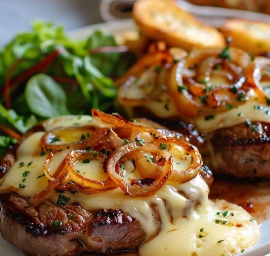 Indulge in this deliciously cheesy Parisian steak! Perfect for a cozy dinner.