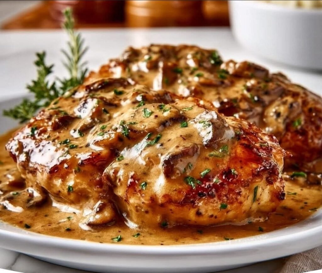 This smothered chicken is the ultimate comfort-food dinner: perfectly seasoned chicken breasts finished under a blanket of velvety mushroom cream sauce and bubbly, melted Monterey Jack cheese. The sauce clings beautifully, the mushrooms add earthy depth, and that cheesy top makes every bite irresistible. Serve it with mashed potatoes, rice, steamed veggies, or Texas Roadhouse-style rolls for the full experience.